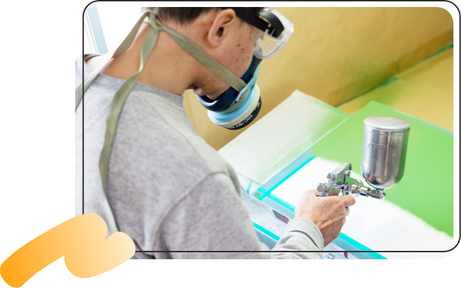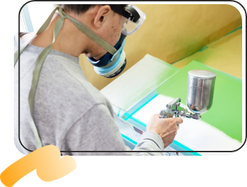 吹付ブースや乾燥棚など塗装に特化した環境にて、熟練の職人が吹付から塗りまでおこなっています。
